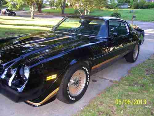 1979 CAMARO Z28, This is a 2 owner Z28 ,bought new in charlotte north carolina at city chevrolet and has been in north carolina all its life,with only 99,000 original miles this car has never had rust and with it's very nice black paint and beautiful gold decals this Z28 is a true traffic stopper ,paint is less than a year old,i have tons of receipts .Engine trans and rear diff were rebuilt less than 5,000 miles ago and i have the receipts from rebuild,new carb.new exhaust new tires and new carpet.the seats are all original and in very nce condition.this z28 has power windows,power door locks,a/c,rear defrost ,powers steering , power brakes and speed control .it is all original no modifications to any thing it is just as it came from city chevrolet in 1979 it even still has the 8track tape player in it.IF YOU HAVE ANY QUESTIONS PLEASE E-MAIL OR CALL JOE AT 704-351-7215 THANKS.