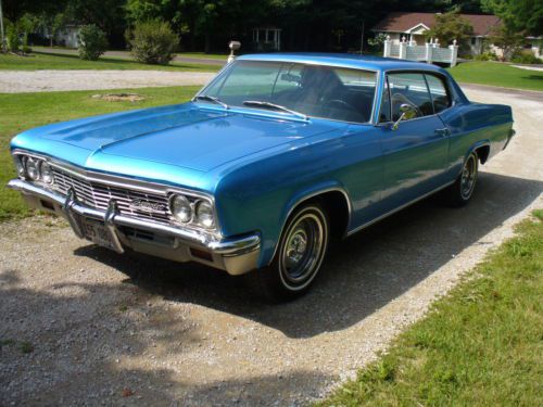 Your bidding on a Marina Blue 1966 Caprice with a numbers matching 275hp 327cu in 4BBL engine, Factory Air conditioned, Powerglide Automatic w/factory floorshift and console with gauges, Bucket Seats, Power Steering, Power Disc Brakes, Rallye Wheels w/ new tires. Still has owners manual and Protect-o-plate. This car was built and sold in California , then sold to a dealer in Oregon, where it received a new paint job then I purchased the car in May of this year and shipped it to central Illinois. This is a very solid, reliable, great driving car. The reserve on this car is set low and priced to sell. I will not reveal the reserve price to non-bidders, so please don't ask. A deposit of $1000.00 is required within 24 hours of auction end, Balance due with in 7 days by bank wire transfer and my bank will do the title transfer. Shipping is totally the buyers responsibility. |