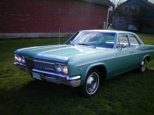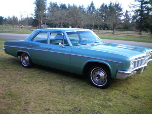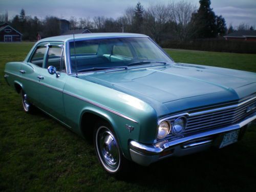 Up for worldwide auction is a 1966 Chevrolet Bel-Air 4 door sedan. It has just over 19,000 original miles . It runs and drives and handles like new . You can barely hear the 283 V8 engine run .Still has date coded spark plug wires .It shifts great and has a 2 speed powerglide transmission. paint color is called Artesian Turquoise with matching interior . It looks like condition of a 1 year one car . This car is impressive and even smells like a new car .Only 2 owners since new and the pictures tell the story here .Whoever buys this car will more than happy with condition and performance of the car. Its hard to write an ad to describe the condition and originality of this car .Come see for yourself or have it checked out Inspections are welcome . The car has had chrome window trim added that is removable , new tires and upgraded headlights other than that its 100% stock. Cars of this caliber don't come up for sale too often . I can help with shipping or airport pickup if needed . Please call with questions or offers Jim 253 576 4419