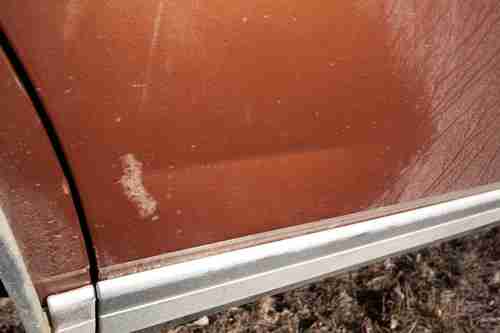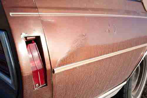 -The second is a small dent in the passenger rear quarter panel . In the picture you can see some surface rusts spots as well. This is from when a dog ran into the side of the car at high speed while chasing another dog... it happened while i was driving... it was NOT from an impact with something hard. It cracked the paint and popped the marker light out of the housing but the dent is very small in the actual body panel itself. Its mostly just the paint cracks that you will notice.