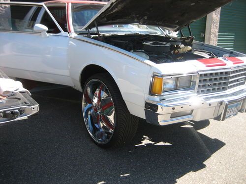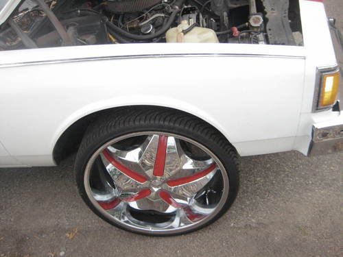 1984 Chevrolet Caprice Classic 2 Dr Custom, sitting on Starr 26"s, w 255/30ZR Antyre HP 166 tires (almost new) (I has some damage) see pic's. A/C has been cut, PS - PB -tilt whl - auto - 305 C.I. 4BBL engine (Correct to car). Engine runs very strong, starts easy and has no funny noises. The trany shifts good and the brakes work good (disc front-drum rear). The body is very solid, the paint is good (not show quality) and no rust showing any where, although there is bondo in a few areas. Comes with Kenwood KVT 516 monitor w/DVD receiver stereo - no speakers or Amp. Although the wiring to the trunk is set-up (has 150 amp fuse) check pic's. All glass good, windows all work - no cracks -the lights and blinkers all work. The 305CI engine has a Edelbrock 4BBL after market carb, with chrome air-cleaner & some 8.8mm accel HP plug wires. It has headers and cherry bomb mufflers, for that mean sound. The problems with the car are pretty minor and easy fixes. The windshield outside upper molding is missing - the vinyl top has some cracks (no big rips), the dash pad is rough, it has cracks & rips. The Headliner is loose & needs to be reattached. The floors & trunk are solid for the most part. All in all this ride is a real Bad Azz "Donk", and will turn heads wherever you go. Although the car runs & drives I do not know if it will make a long road trip on its own. It would be recommended to trailer it home. Clean title in my name with current tabs. Selling no Reserve. I do have the right to end the auction at any time and for any reason. If you have any questions, email me & I will get back to you. I will be able to store the car for as long as you like for $300 per month provided it is paid in full within 7 days of the auction end, and provided the storage payment is in advance.