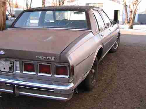 1984 CHEVY CAPRICE V8 305 , CRUISE ,TILT, POWER WINDOWS,AC,POWER DOOR LOCKS,NEWER CD PLAYER AND DASH SPEAKERS, NEW CARB OVERHAUL, BOUGHT AT A POLICE AUCTION, TIRES FAIR,BELTS FAIR , NEW TIMING CHAIN, VALVE COVER GASKETS, NEEDS PAINT, NEEDS NEW TOP(DRY ROTTED).EMISSION COMPONENTS HAVE BEEN REMOVED BUT WILL GO WITH CAR. RUNS GOOD BUT NOT A PERFECT CAR,NEW WIPERS, AND ADD ON WASHER PUMP.ASK QUESTIONS ,