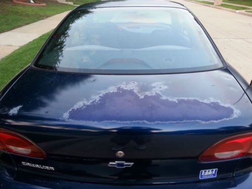 Up for sale is a used 2001 Chevy Cavalier 2-door coupe. It runs pretty well, and the A/C was blowing cold when I drove it the other day to test it out. It had an exterior wash and a comprehensive vacuuming recently. It only has 112,625 miles which is pretty light for a 2001. It has a CD player and working radio. It has a clear title. The car was my mother-in-law's, and I have the title and keys in hand. Kelley Blue Book has its value at $1,820 in fair condition. Most of its deficits are purely cosmetic. It has cracks in the dashboard from the sun. It also has a broken piece of plastic above one of the air vents. The hood and trunk have some sun damage to the paint job, and the exterior has hail damage. The inspection is good for a few months more, but the registration runs out at the end of May. It could also use a good shampooing on the upholstery. There is a stain from a spill on the front passenger seat. The trunk occasionally leaks a little water, but the trunk has a spare tire in it for emergencies too. The back left brake light seems to need replacing more often than most as well. It could also use a tune up and oil change (just for good measure), but like I said, it seems to run fine.