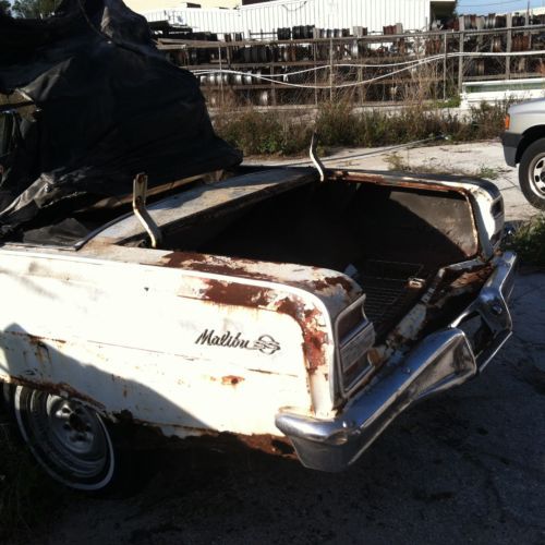 TODAY UP FOR AUCTION IS A 1964 MALIBU SUPER SPORT V8 AUTO CONV , WITH A SPARE CONV FRAME.I HAD PURCHASED THIS 64 CONV AND TWO OTHERS IN 2008OFF E BAY. ONE TO BUILD TWO FOR PARTS. THE ONE TO BE RESTORED WAS A 4 SPD FACT CAR.ONE PARTS CAR WAS THIS ONE AND THE OTHER JUST A MALIBU. TURNED OUT ONLY NEEDED THE NON SUPER SPORT CONV FOR PARTS.SO I DID NOT TAKE THIS ONE APART.ONLY THING MISSING IS THE TRUNK LID. USED ON THE PEDDLE CAR .THE REAR FRAME RAILS ARE RUSTED OUT THAT IS WHY A SPARE CONV FRAME WAS PURCHASED FRAME WILL GO WITH THE CAR TO THE NEW OWNER .THE MOTOR IS NOT ORIGINAL. THE REST OF THE CAR IS .THIS CAR WAS LAST REG IN MARYLAND I PURCHASED IT FROM A SOLDIER STATION THEIR HE WAS BEING SHIPPED OUT .THE CAR RAN AND DROVE OFF THE TRANSPORT EXCEPT WEEK BRAKES. I WILL GET IT RUNNING AND DRIVING ON IT OWN TO SELL.NO GAS TANK SO IT WILL RUN OFF A CAN .AFTER I CHOSE NOT TO USE THIS CONV FOR PARTS I WAS GOING TO BUILD IT . I SOLD THE PEDDLE CAR IN 2010 TO A FRIEND NEEDING PAINT AND PUT BACK TOGETHER .WELL I PICKED IT UP IN THE SAME CONDITION I DROPPED IT OFF 3 YRS AGO SO NO NEED TO BUILD THIS CAR. HE SOLD IT BACK TO ME . A TRUE CAR GUY I TOLD HIM IF YOU EVER SELL IT WOULD YOU GIVE ME A CALL .LOOK THIS CAR CAN BE RESTORED BUT NOT FOR THE FAINT OF HEART.NEEDS FRONT FLOORS, BACK IS GOOD. REAR CONV BAY SUPPORTS ARE GOOD FOR TOP NEEDS INNER AND OUTER REAR WHEEL WELLS..FRONT FLOORS SILLS ARE GOOD DOOR JAMS ARE GOOD. NEEDS COWL REPAIR AROUND FRONT WINDSHIELD FRONT CLIP IS GREAT EXCEPT LOWER FENDERS .DOORS ARE GOOD ALL GLASS IS GOOD GUTS OF FRONT AND REAR WINDOWS ARE THEIR IT IS A POWER TOP ALL IN TACT.FRONT AND REAR SEATS ARE IN CAR SO ARE BACK SEAT SIDE PANELS WITH ASH TRAYS. CONSOLE AND SHIFTER ARE ORIGINAL.DOORS HINGES NEEDS HINGE PINS OR NEW ONES. THEIR IS A LOT OF RUST ON CONV TOP BUT ALL THEIR . HOPE THE PICTURES TELL YOU THE SAME AS I DID, IF NOT PLEASE CONT ME ON E BAY AND I WILL GET BACK ASAP. THANK YOU HAVE A SAFE AND HAPPY HOLIDAY. P.S. I HAVE BILL OF SALE FOR CAR LOOKING FOR TITLE AND FOLDER IF I CANT FIND IT I WILL APPLY FOR A NEW ONE AT END OF SALE IF CAR SELLS .ALSO WILL PULL SEATS OUT AND ADD BETTER PICTURES SOON TO HELP YOU BETTER SEE WHAT CONDITION ITS IN . I AM A SAND BLASTER BY TRADE SO RUST WILL NOT STOP ME !!! I LOVE TO TAKE A CAR LIKE THIS AND WHEN ITS DONE TAKE PICTURES . WHEN I SELL THEM PEOPLE CANT BELIEVE THAT I STARTED WITH THE FIRST FEW PICTURES .ITS TIME TO BUILD CARS THAT I WILL KEEP FOR MYSELF ******