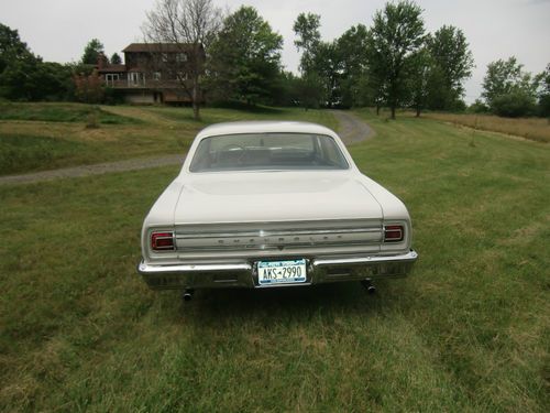 This is a nice 65 chevelle, very straight body, some rust on the bottom of the fenders and quarters, doesnt seem to have any bondo or plastic filler, paint is very shinny, all doors, trunk and hood open and close perfectly. Has a 283 with a 3 speed manual tranny. It has the shifter on the floor, but the original shifter on the column still there. The 283 engine has just been rebuilt , was bored .030 over, new pistons, bearings, oil pump, mild cam, new aluminum intake and 4 barrel edelbrock carb.(the original intake and 2 barrel are in the trunk). The engine has less than 20 miles on it. Also new are radiator, clutch, engine and tranny mounts and engine accesories. Car runs and drives beautifully. Interiors are in very good shape. The tires are old and worn out but still hold air. Frame and undercarriage are in great shape with no rot or holes. Floors and trunk are solid. It has some surface rust in the trunk floor. All the glass, and windows in great shape. For info call RAY at (585)455-2615.