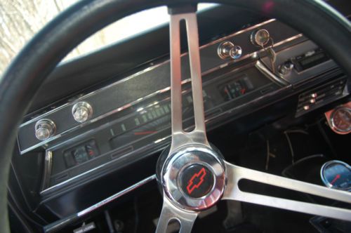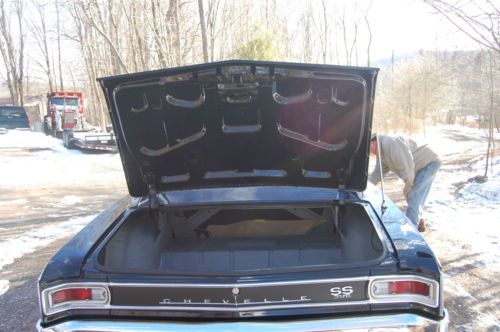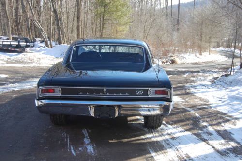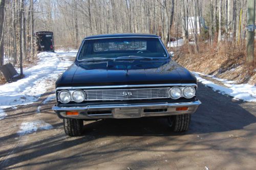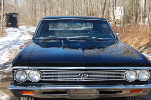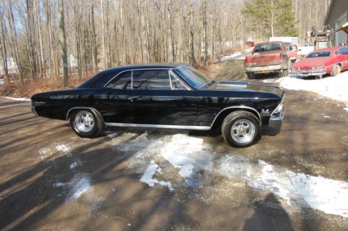 UP FOR SALE IS THIS VERY CLASSIC AMERICAN MUSCLE CAR. THIS BLACK BEAUTY IS A TRUE 138 CHEVELLE SUPER SPORT. IT IS THE REAL DEAL WITH A 396 CU. IN. ENGINE , MUNCIE 4 SPEED AND A 12 BOLT POSI REAR. THE CASTING # OF THE BLOCK IDENTIFIES IT AS A 1966 396 / 360 HP PASSENGER HIGH PERF FOR A CHEVELLE. THE CASTING # FOR THE HEADS ARE ALSO 1966 360 HP. THE STAMP PAD ON THE BLOCK WAS AND STILL IS BLANK (MUST HAVE BEEN WIPED CLEAN IN AN OLDER REBUILD ). SO AT THIS POINT WE KNOW THAT THE ENGINE IS 1966 CORRECT, BUT WE DON'T KNOW IF IT WAS BORN IN THIS CAR (NUMBERS MATCHING ), COULD HAVE BEEN ALL ORIGINAL BUT AGAIN STAMP PAD IS BLANK , SOOO. I GOT THIS CAR FROM A GOOD FRIEND AS PART OF A BUSINESS DEAL TOGETHER. HE BOUGHT THIS CAR DOWN SOUTH EARLY LAST YEAR AND HAD THE BODY AND INTERIOR RESTORED AND PAINT COMPLETED IN NOVEMBER 2013. NOBODY WAS SURE OF ENGINE CONDITION SO I SENT IT OUT AND HAD IT TORE DOWN AND REBUILT. IT IS A 396 BORED 30 OVER TO A 402 , STOCK 402 PISTONS,CRANK POLISHED , 10 OVER ROD BEARINGS , MAINS , CAMSHAFT BEARINGS AND SEALS INSTALLED. MUTHA THUMPER COMP CAM HIGH VOLUME OIL PUMP. MOTOR IS IN THE CAR FOR ABOUT A WEEK, IT IS AWESOME ! AND SOUNDS GREAT. A LOT OF NEW PARTS THAT INCLUDE NEW BADGES, TRIM, DOOR HANDLES, MIRROR , GRILLE, LIGHT LENSES , WINDOW GASKETS , FELT CHANNELS , DOOR GASKETS ,TRUNK GASKET , NEW INTERIOR WITH DOOR PANELS , HEADLINER AND CARPET. NEW CENTER FORCE CLUTCH. ALUMINUM RACE RADIATOR WITH DUAL FANS , ENGINE CHROME KIT , AND MORE. ALSO HAS TINTED WINDOWS AND EXCELLENT CHROME.. THIS CAR IS READY TO ROLL. NICE , NICE , NICE !TITLE SAYS 30,000 MILES BUT THERE IS ABOUT 2 MILES ON FRESH ENGINE. BID WITH CONFIDENCE ON THIS GREAT CAR NOT ONLY FOR FUN BUT ALSO FOR A GOOD INVESTMENT. SELLER RESERVES THE RIGHT TO END LISTING EARLY BECAUSE CAR IS FOR SALE LOCALLY. CAN SEE VIDEO ON YOUTUBE , SEARCH SWEET 66 CHEVELLE.