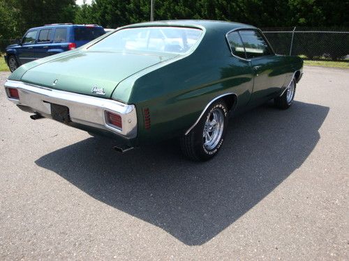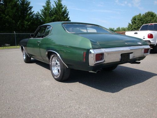 1970 CHEVELLE GREAT PROJECT CAR. SOUTH CAROLINA CAR. CAR HAS HAD A LOT OF WORK ALREADY DONE TO IT. HAS HAD THE FLOORS CLEANED AND PAINTED. FRAME HAS BEEN CLEANED AND PAINTED FROM THE FIREWALL BACK. HAS HAD THE MOTOR REBUILT BUT NOT THE ORIGINAL. UNDER THE HOOD THE FIREWALL AND RADIATOR SUPPORT HAS ALREADY BEEN CLEANED AND PAINTED ALONG WITH THE INNER FENDERS. LOOKS NICE UNDER THE HOOD THE WAY IT HAS BEEN DETAILED. FULL NEW EXHAUST FROM THE COATED MANIFOLDS BACK WITH CORRECT OVAL TIPS. NEW SHOCKS. NEW CHROME WHEELS. NEW CARPET. NEW LEFT FENDER, AND NEW COWL HOOD. HAS A BORG WARNER 4 SPEED TRANS WAS ORIGINALLY 3 ON THE TREE. DOORS ARE VERY SOLID. ROCKERS ARE GOOD. NEEDS PATCH IN LOWER RIGHT FENDER BUT IS INCLUDED. PATCH IN DRIVERS FLOOR. INTERIOR IS COMPLETE WITH WORKING LIGHTS, INTERIOR LIGHT, EVEN THE BUZZER STILL WORKS. ORIGINAL DECALS STILL IN DRIVERS DOOR. ALL GLASS IS THERE AND GOOD. CAR NEEDS RUST REPAIR AROUND BACK GLASS AND TRUNK GUTTER. NEEDS TRUNK FLOOR WORK OR REPLACEMENT. FILLER BETWEEN TRUNK LID AND BACK GLASS. DECK LID. LIP WORK OR REPLACEMENT ON REAR BODY PANEL. ALL CAUSED BY THOSE GOOD OLD SOUTH CAROLINA PINE NEEDLES. WOULD MAKE A GREAT 454 SS CLONE. ALREADY HAS A GOOD START. RUNNING AND DRIVING PROJECT. NEEDS A FULL RESTORATION . SS DASH PANEL, REAR GLASS TRIM, LOWER PATCH INCLUDED. SOLD AS-IS. CAN END AUCTION EARLY. CAN CANCEL ANY OR ALL BIDS. EMAIL WITH QUESTIONS. COME LOOK AT CAR IN PERSON BEFORE BIDDING. CLEAR TITLE.
