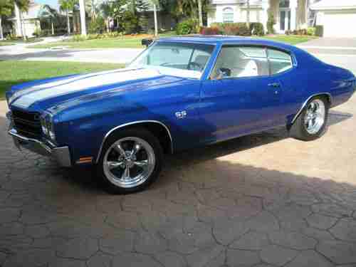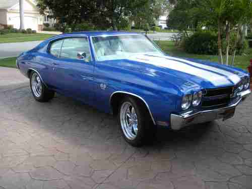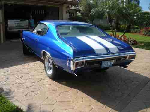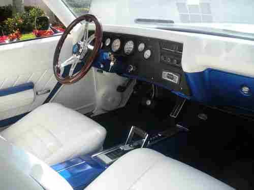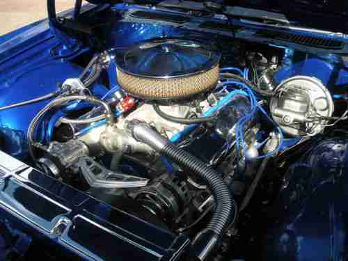 Complete frame off rotisserie restoration, powder coated frame and all suspension parts including springs torsion bars, Complete Body Bead blasting-etch primed-two coats metallic silver overlay- 3 coats house of color trublue- 3 coats clear, all polyurethane high performance bushings, KYB Gas shocks, front end rebuild parts, all new stainless steel brake and gas lines, New vacuum booster and master cylinder, 4 wheel disc brakes with drilled & slotted rotors, Polyurethene motor mounts, New Fuel Tank, Custom stainless steel exhaust system 21/2", New fornt and rear bumpers, Rear LED tail lights and new side lights, New grille and Trim, New tilt steering column with Grant steering wheel, Master body nut and bolt kit, new Electric Life power window conversion kit, New door handles in and out, All new glass- side front and back, New Emblems and stainless trim, New interior and exterior rear view mirrors,Covan Classic dash insert w/ Autometer Phantom Gauges, 4.10 to 1 posi rear end, 700R4 Street Fighter overdrive transmission, Secret Audio remote radio, Pioneer rear speaker-kick panel fornt, Vintage air super Gen 11 A/C, heater and defrost, Interior completely covered in Dynamat Extreme, American autowire complete with new wiring system, Custom leather interior by South Seats, Orginal # match 396 cubic inch short block complete rebuild, Custom Comp Cam, Hydrolic roller lifters, Pioneer roller rockets, Manely Heavy Duty push rods, Edelbrock 60499 Aluminum cylinder heads, Felpro gaskets, Edelbrock 7561 air gap intake manifold. Heavy duty oil pump, Edelbrock 750 CFM carborator, March Ulta polished aluminum serpentine Belt conversion system with aluminum power steering remote reservoir tank system, Holly fuel pumpp with pressure regulator, Flex-a-lite- dual electric fans, Hooker coated Headers, American racing wheels 18" rear 17" front, Nittro tires SSS