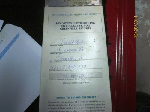 Factory documentation is the original Protecto-Plate provided to original owner when vehicle was sold new in Greenville SC on June 28, 1970.