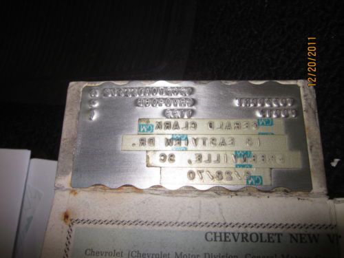 3. The original Protecto-Plate is present. It documents the VIN number, engine, transmission and differential code, and also the selling dealer and date the vehicle was sold new. Sorry, we do not have a build sheet or prior owner history.