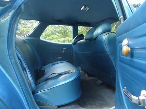 As for the body it was just painted its original blue and looks awesome, it turns heads everyway it goes. Rear windows were removed before paint and re-installed with new seals. Rubber weather stripping was replaced on all four doors. Interior is clean except for front seat some of seat seams came apart, I have a seat cover on it.