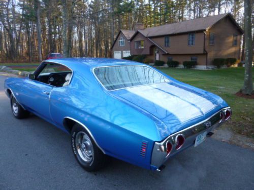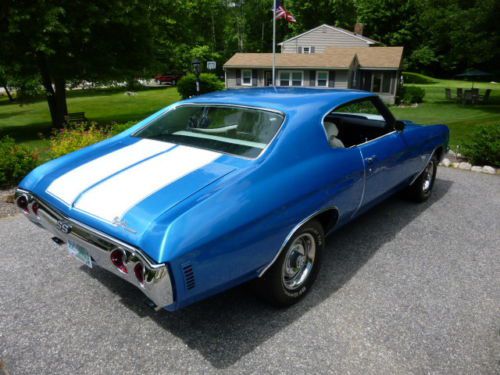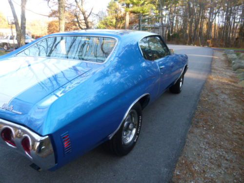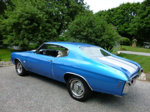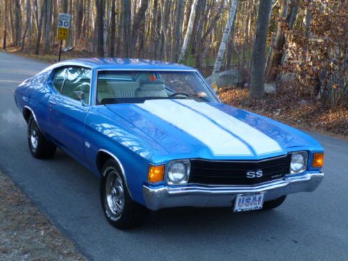 1972 Chevelle 396 TH-400 SS Badge Blue white cowl stripes with beautiful SS package white interior Bucket seats brand new center console horse shoe factory shifter, fresh dash cluster 10-bolt 3:73 gears Power steering front disc brakes, Motor just completely detailed and tuned, header with flow master exhaust and H-pipe,SS tips and sound like a big block should not many miles on since rebuilt and no leaks including trans , edelbrock Hi rise, Hi torque starter, restoration included New floor pans,and trunk pan. inner fender panels when restored I would say 5-7 years ago and still opens eyes being very clean and straight. Corvette rallys 15X7 with BF T/A Goodrich radials 255/60/15, Car just had complete front end alignment, new upper control arm bushing and ball joints, handles and drives tight. New master cylinder along with recondition windshield wiper motor and washe. Very clean and detailed show and shine high gloss paint base coat clear coat, car is clean from top to bottom. This Chevelle is a great cruise night or weekend car shows classic several new parts backed with great performance and handling. Everything in working order along with great sound system. As they say nothing like a big block Chevelle ...... I have this car listed locally and elect to end auction at any time and without notice. Serious buyers are welcome to contact with any questions and or buying arrangements. Enclosed shipping quotes availabile with state and zip code. Contact: 603-583-0024 |
