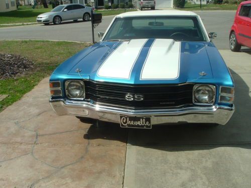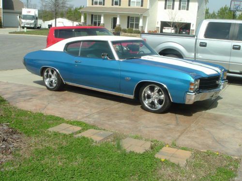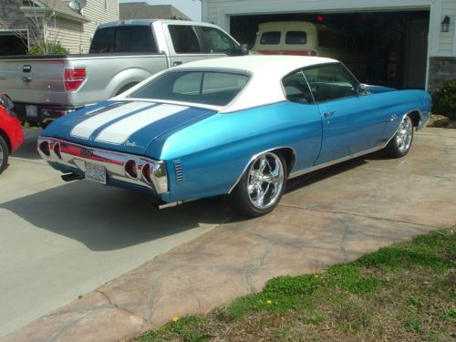 1972 CHEVELLE BIG BLOCK 454 WITH AIR STRAIGHT CLEAN BODY,REAL NICE BLUE PAINT AND NEW WHITE TOP, NICE CAM AND REBUILT 400 TRANS,UNDER CARIAGE CLEAN SOLID NO RUST,ALL NEW CHROME, FACTORY AIR POWER DISC BRAKES, POWER STEERING, 454 DUAL BREATHER, NEW COY WHEELS 17 FRONT 18 REAR WRAPED IN NEW TIRES, EDELBROCK CARB WITH ELACTRIC CHOKE AWESOME SOUND SYSTEM, SUPER NICE NEW BLUE INTERIOR MUST SEE FORE SALE LOCALY I HAVE THE RIGHT TO END ADD IF SOLD |