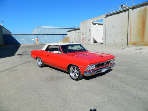 This 1966 Chevelle Convertible is a frame-off restoration with suspension up-grades for better handling, ready for you to get in and drive anytime, anyplace. Building a special muscle car takes time, foresight, and money, and this owner had all three. With mirror finish Red paint with White bucket seats and White convertible top, it is just the right color combination that will have all heads turning your way. For power, what's better than a correct 396 (newly built) and T10 four-speed with a 10 bolt Posi rear-end. This re-creation really gets with the program, and really gets there fast. The car features power steering, power brakes and a power top. For that old school look, American Mags finish off the look. Top of the line Chevelles have always been one of the American classics to have in every collector’s garage, and this one is no exception. This is an excellent find. So Bid Fast and Enjoy the Ride………………. Please don’t ask about the reserve we will not disclose it. Now for the fun stuff; All questions regarding this vehicle will be answered by the owner of the vehicle. There are two convenient ways to contact us; email us at rick@classiccarmarketing.net or give us a call at 619 972 7073. Please remember, all questions will be sent to the vehicles owner to be answered. The reserve is set very low, so bid fast, have fun and enjoy the ride………………. This vehicle is being offered as is, where as with no warranty, expressed, written or implied. The seller shall not be responsible for the correct description, authenticity, genuineness, or defects herein, and makes no warranty in connection therewith. Any inspections are to be done prior to close of auction. Classic Car Marketing, Inc. (herein referred to as CCM) recommends that an inspection be done prior to the purchase of any vehicle any time, any where, and although CCM does their best in providing accurate descriptions of all vehicles advertised, every vehicle offered for sale by our client is the sole responsibility of the client and all descriptions have been provided by the vehicles owner. CCM and its Officers assume no responsibility for any information that the client provides, or actual condition of any vehicle advertised. CCM acts only an advertising venue and does not negotiate, represent, or offer for sale. Some photos may be provided by our clients. CCM has made every reasonable effort to disclose any known defects associated with this vehicle, but assumes no responsibility as to actual condition of vehicle, all information has been provided by the owner of the vehicle. Payment to be made through wire transfer or certified funds; vehicle will not be released until funds are received and verified by owner. Vehicle must be paid in full within 5 days of close of auction. This listing is available locally and owner has reserved the right to end auction without notice. Buyer is responsible for transportation of vehicle and vehicle must be picked up within 14 days of close of auction unless prior arrangements are made. Good Luck and Happy Bidding