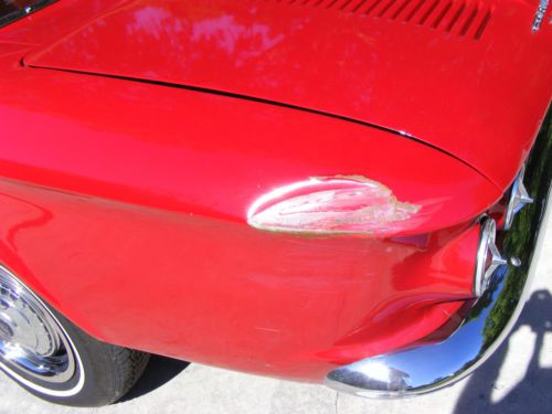 Just in time for summer to drive with the top down. Up for auction is a 1963 Corvair Monza 110 hp. twin carb convertible. This Florida car is garage kept and had the top replaced last year. This car is like my first prom date, she's a looker from 20 feet, but could use a little TLC. Cosmetically, she has a few wrinkles and a dent on the rear quarter panel. There are close up pictures of the two damaged areas. The interior is in ok shape. It is clean, but there is wear and tear on the seats and the dash has a few splits. Mechanically, the steering is a little loose and the engine probably needs to be rebuilt. The car ran up until last week, now it is knocking and will not turn over. My loss is your gain. I don't have the time to rebuild the engine so it is being sold as is. $500 deposit due 24 hours at close of auction. I will personally get in contact with you for arrangements of the remaining balance. Buyer is responible for all shipping arrangements, but I will help with pick up time and date on my end. For any questions or additional pictures please respond to this site. Thanks for looking