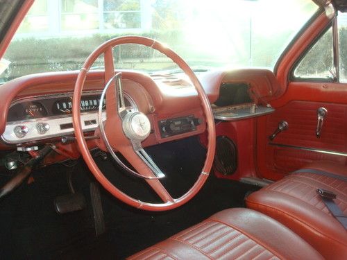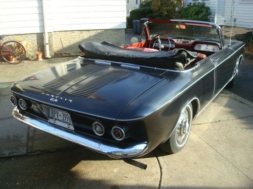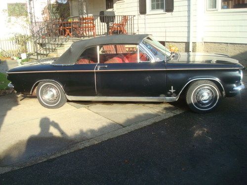 1964 CHEVROLET CORVAIR CONVERTIBLE , LOOKS GOOD , RUNS OK , BLACK WITH RED INTERIOR . DRIVERS SEAT NEEDS TO BE RECOVERED , TOP IS GOOD ( ONE SMALL HOLE ) . TIRES VERY GOOD , SPOKE HUB CAPS , BATTERY GOOD , NICE CAR TO RUN OR RESTORE , GLASS ALL GOOD , AUTOMATIC TRANSMISSION . QUESTIONS CALL GEORGE 914 664 4050 .