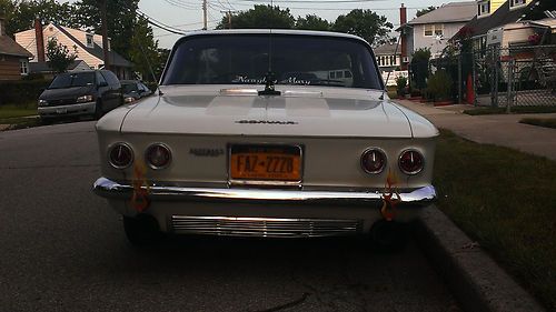 You are bidding on a 1963 corvair coupe monza 900.It has 24000 original miles bought in franklin square NY and has never left town.I bought this car for an man in town in his 70s dont know if he was the original owner.It needed a tun of work.Lets start with the motor ,new carbs, exaust dual off a 2013 victory high ball motorcycle flaired into the body ,points ,condencor,wires, cap ,rotor ,plugs, belt, gas sending unit ,break line from front to back,.valve cover gaskets, oil pan gasket, push rod tube seals ,valve ajustment ,1962 impala antennas that work, cb cd sterio ipod ready, fog lights, tires are white walls in good condition, the rims are powder coated white, wheel skirts, breezes, a visor modifided to fit from a 1959 chevy pick up, trunk pan ,floor pans ,new customcrazy carpet, A custom paint job on the front end done by the Outer limits art studio in franklin Square NY.The inerior is intact but needs work will send pics upon request. tinted windows 35%.There is some rust on the drivers door that need looking after and by the passenger back windshield. But over aklthe car is solid.Ive been using it as my ever day car but its time for it to go. I dont have anywhere to keep over the winter and it diserves to be garaged.Please e-mail me with any questions or call 516 652 5139 Bob Thanks for looking