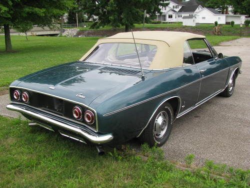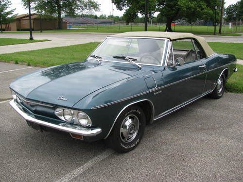 This is a very nice Corvair corsa with the quad carbs. The car starts and runs and shifts fine. I do not know what kind of work has been done to the car but by the looks of it there has been a lot. The man that owned it last pasted away and the widow is selling the car, they really loved the car, and had it for a long time. The only spot I could find that was starting to rust some was the driver side bottom at the pillar post (see pic). The rest of the car seems real soild there is a little bubbling on the rocker at the bottom nothing major. The under side of the car looks great. There is a little rust spot at the bottoms of both front fenders. The interior is nice, the passenger side arm rest pad could use a replace. Other than that its nice. The power convertible top works great, and the top is new. The car brakes just fine, and the tires are real nice. The paint it driver quilty and looks fine. The car is not missing anything that I can tell, and will make someone a fun driver. If you have any? please call 419-571-9777. THIS IS A NO RESERVE AUCTION.