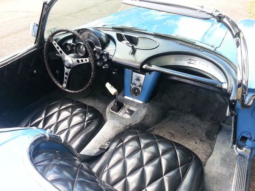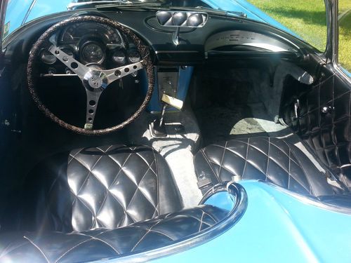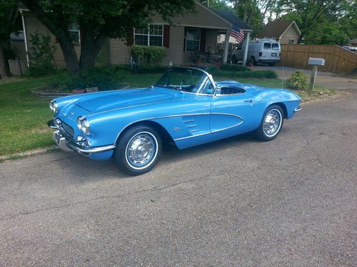 I am offering for sale a 1961 convertible Chevrolet Corvette. The color of the car is Jewel Blue and only 855 of the 10800 produced this year were this color. The exterior of the car has the original paint job and is in fair condition. There are some scratches and defects in the paint but the paint is in surprisingly good shape to be vintage. The car has both the original hard top and the soft top. The interior is black and blue but is not the original interior.