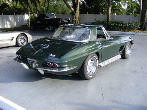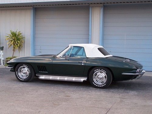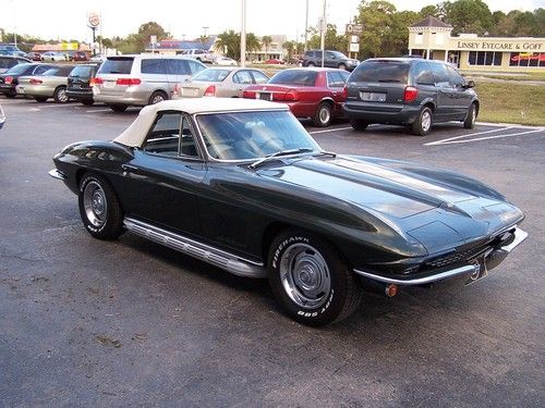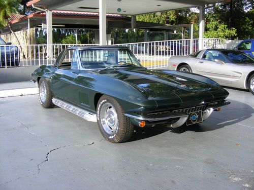 1967 Corvette Convertible, Goodwood Green with white interior, this is a matching numbers car with the L79 engine 327 c.i. 350 h.p., four speed manual transmission, side exhaust, power steering, power windows. The carbeuretor, distributor and radio are not correct for the car. This beautiful Corvette roadster also features the auxiliary hardtop and new Tiger paw tires. This vehicle qualifies for our exclusive V.I.P. 84 month financing plan. Call for details. Toy Store, Largo, Fl. 727-585-6000, toll free 888-655-9577. Open 7 days, trades considered. WE BUY CLEAN CORVETTES