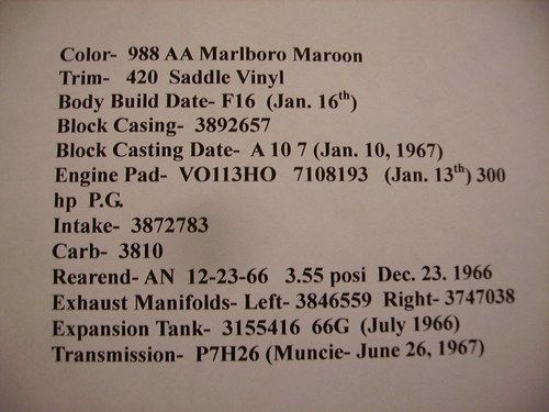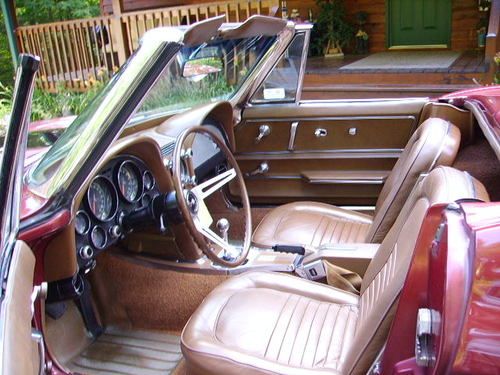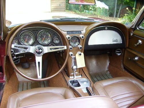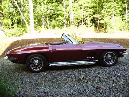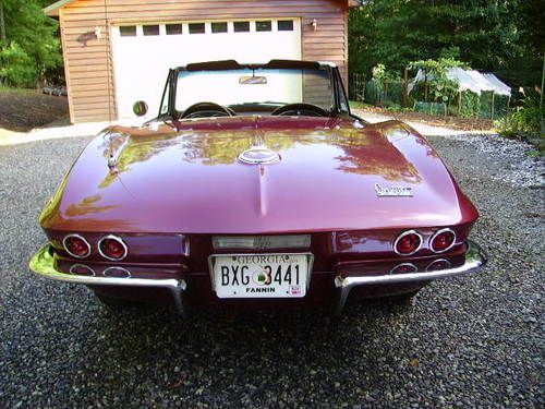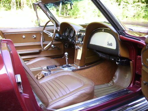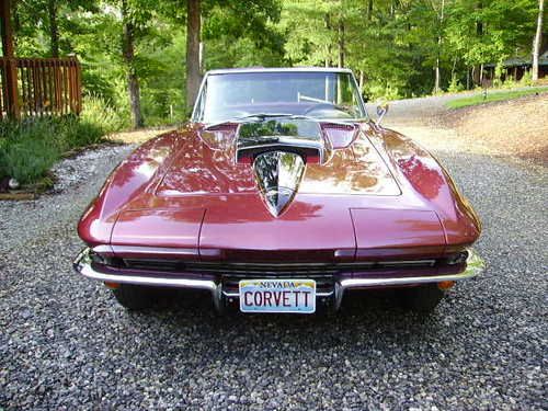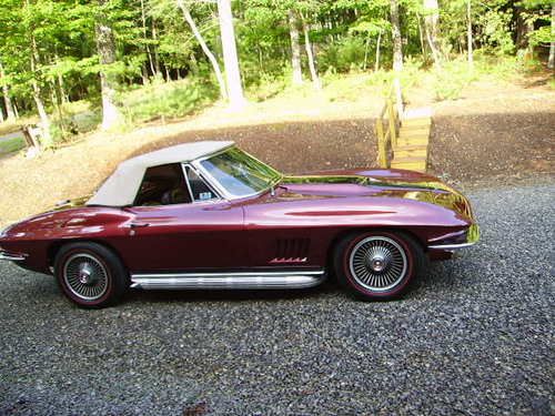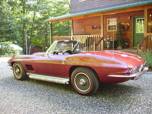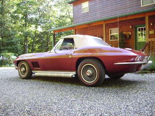 This 1967 Corvette convertible is loaded with options. It has factory air conditioning (cold), power steering, power brakes, tinted glass, AM/FM radio, 2 tops, side exhaust, 3.55 posi rear-end, bolt-on aluminum wheels and Michelin redline radial tires. The previous owner, of 15 years, converted it from a powerglide to a 4 speed transmission. He also updated the suspension. It's the best of both worlds. It is an original mid-year with a great ride and handling. The car runs, drives and stops excellent. It does have the matching number 327/300 hp engine, intake, carb, exhaust manifolds and rear-end. It is the original colors of Marlboro Maroon with saddle vinyl interior and tan convertible top. All of the lights work as they should including the back-up lights, glove box light, turn signals, headlights etc. The headlight motors roll up and down and the wipers work. All of the gauges work including the clock. It has the jack and the original spare tire. The underside is nicely detailed as well as the engine compartment. The body is very nice with the bonding strips as they should be. The frame is excellent. The paint is very nice. It has the correct air cleaner, ignition shielding, plug shields, clear floor mats, seat belts, shifter and battery cables. I do have the original small block hood that comes with the car along with some receipts. Inspections are welcomed. I can be reach at 706-838-0166,