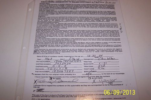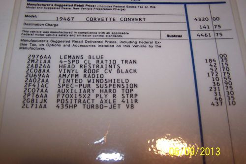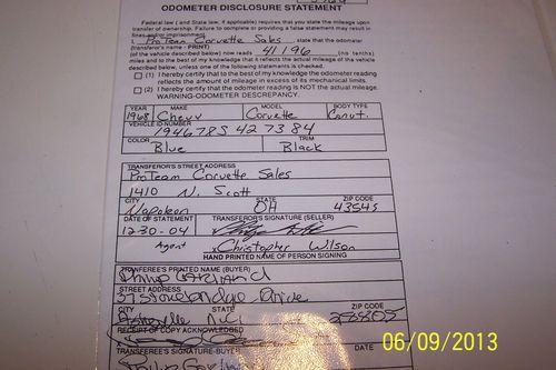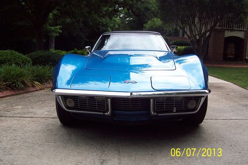 This numbers matching 1968 Corvette Convertible Roadster L71, 427/435, 4:11 posi rear end has only 42,258 miles. It is an unrestored original car in excellent condition with 1 repaint in it's original color of LeMans Blue. It was purchased from Pro-Team Corvette in 2005. (A renowned authority on Corvettes) Pro-Team aquired it from The Mecum Collection in Dec. 2004. Pro-Team inspected the car and found it to be numbers matching and correct. The casting number, casting date, pad date, pad VIN, build date, trim tag and paint code were all found to be matching and correct. (See picture of the Disclosure Addendum to Sales Contract) The mileage was authenticated by Pro-Team as denoted on the Odometer Disclosure Statement. (See picture) The car was built in St. Louis but spent at least part of it's life in California. The carburetors were rebuilt recently and it starts and runs great throughout the entire throttle range. Everything works, including the windshield wipers. All dash lights, console lights, warning lights, idiot lights, gauges, clock, radio etc. are all in working order. Ready to be judged. It comes with the original black auxillary vinyl hard top. It is 1 of 1758 with it's option package & color. It is equipped with the M21 close ratio 4 speed transmission, head restraints, vinyl roof, AM/FM radio, tinted windshield, F41 special purpose heavy duty suspension, posi tract 4:11 rear end and the L71 435 hp Turbo Jet V-8 engine. It is also equipped with great sounding Flow Master Exhaust, Rally Wheels and Firestone F70-15 Red Stripe Wide Oval Tires. It has most factory correct components including seat belts, braided wiring, shifter shielding and air cleaner. Best of all, it is also documented with THE ORIGINAL TANK STICKER. All the documentation is held in a hard binder for organization and protection. (See the picture) Always garaged. No reported accidents. Non-smoker. I have a clear Ga. title in my name. It looks runs and drives excellent. A very high quality investment vehicle.