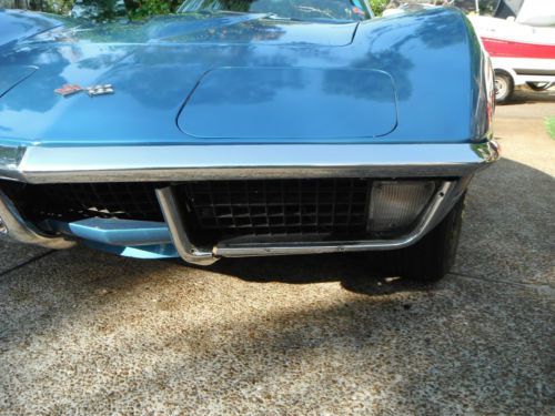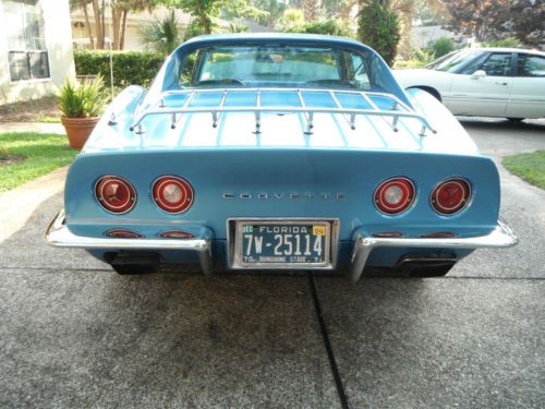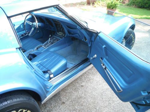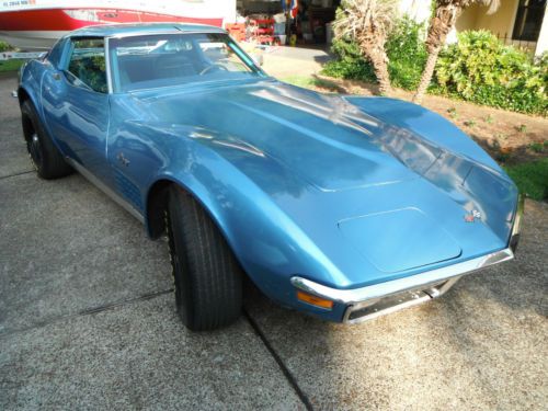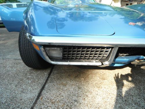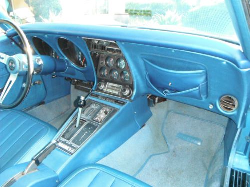 1970 Chevrolet Corvette 2 door coupe 350/300 Auto. Factory A/C Mulsanne Blue with Bright Blue Interior I've owned this car for 20 years and it has been garaged during that period. I have the tank sticker and it's in good shape. The car is an older restoration completed in the mid 1990's. Paint: The car was painted in 1988. Paint is in good shape but not perfect. Car is very presentable. Body: New Rear Chrome bumpers, Front Bumper and Grills are OK, but not perfect, not broken - needs restoration. New tail lights, some new weather-stripping. Front Glass was replaced, door glass is original with Astro ventilation embossed into the glass Brakes: Rebuilt all calipers, brake hoses, rotors and brake master cylinder. No vacuum assist. Tires: These were a special run of Goodyear tires for honoring racing in 1995. They have a yellow lettering on the outside and words Eagle #1. These tires are getting old, but no cracks and probably have 3000 miles on these since installed. Engine: Great condition. Rebuilt to factory spec's in 2011. HEI distributor for reliability was installed. Factory A/C, but does not function. I believe it works, but needs to be rebuilt. Everything installed for A/C, just no cold air. No smoke, plenty of power, great compression. Numbers: The car is a numbers matching car. Over the years of working on this car I have done research and I have found conflicting info on the engine block. The heads, exhaust manifolds, distributor all have a 1970 date code that is close to the build date. The engine block does not, instead I believe it could be a factory replacement 350, but I am not sure Transmission: Great condition. Rebuilt with a small shift kit in 2011, new stall converter. Power Steering: Rebuilt Pump and Cylinder Suspension: Great condition. New Springs front and rear, rebuilt front suspension. No rust on frame or anywhere. Interior: Very good condition. Seats have been recovered to factory original, carpets (now stained) , door panels, rear panels, dash panels have all been replaced. Dash cover, painted to match. All dash gauges work except the clock. Title reads mileage exempt, but I believe it has 179,xxx miles on the car. No power locks or power windows. New heater core - old one cracked and drained on new carpet - New vacuum lines to front of the car, new light actuators, wiper door actuator and springs Original Radio, works, new front speakers in dash. Car easily cranks up and runs great!! More pictures are available if needed. Shipping is the responsibility of the buyer. I do have a transport company I have used and they are very reasonable. Please call Malcolm at 850-528-8865 -- 9AM to 9PM EST. Serious inquires only please.