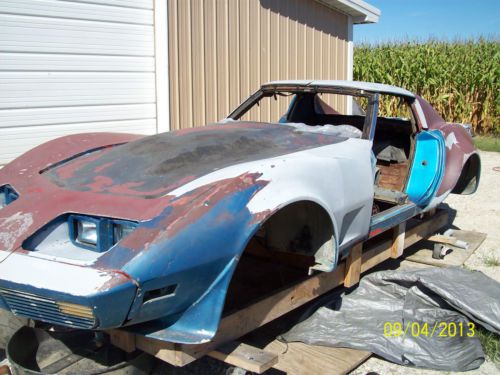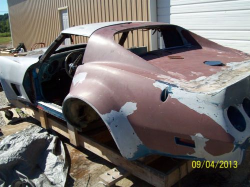 1974 CORVETTE PROJECT CAR WITH A ROLLING CHASSIE, HAS T TOPS AND GREENWOOD STYLE FRONT AND REAR FLARES, FRONT AND REAR SPOLIERS, SQUARE HEADLIGHT MODS, WAS A OLD SHOW CAR , BOXES OF EXTRA PARTS CLEAR TITLE BODY WILL BE SETTING ON FRAME AND WILL HAVE ROLLER WHEELS FOR EASY LOADING, BODY STAND NOT INCLUDED ASK ABOUT DELIVERY HAVE ANY QUESTIONS JUST ASK
