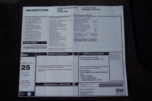 This is a one owner, 2008 Corvette Coupe with the 3LT equipment package. The car is always garaged, is in like new condition and is cigarette smoke free. The car was special ordered from Suburban Chevrolet in Sandy, Oregon and has been serviced every 5,000 miles since the purchase. Base price for this vehicle was $45,170.00. With all the options, the total vehicle price was $57,095.00. Options include; AM/FM stereo, 6 disc CD changer, MP3 Format, Bose Premium 7 speaker system, Head up display, Power telescoping steering wheel, heated seats, memory package, Universal Home Remote, Adjustable sport Bucket seats with perforated leather inserts, 6 way power adjustable seats, luggage shade and parcel net, steering wheel radio controls, Magnetic selective ride control including driver selectable tour and sport settings, larger cross drilled brake rotors, Chrome aluminum wheels, 6-speed paddle shift automatic, removeable transparent roof panel, Crystal Red Metallic Tintcoat. Shipping will be the buyers responsibility but owner will assist in getting the car to the transport means once payment has been completed and cleared through the Bank. If the car needs to be stored for a short period of time prior to transport, owner will work with the buyer to make that happen. Cash would be owners preferred payment choice. |