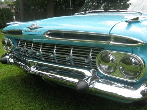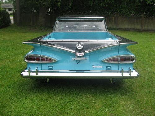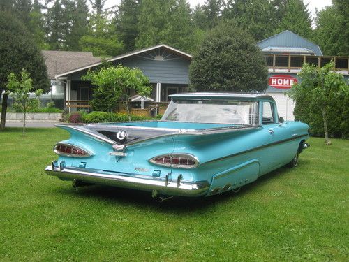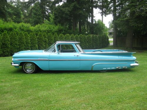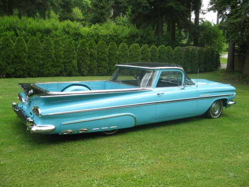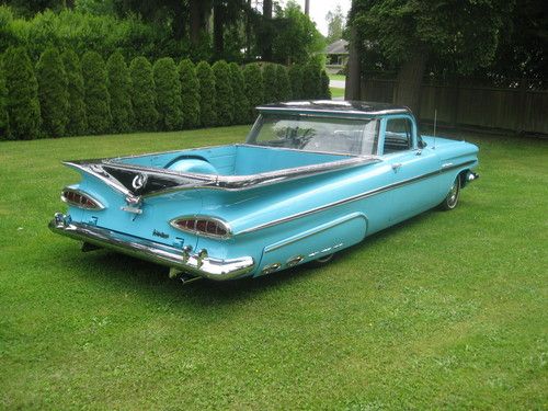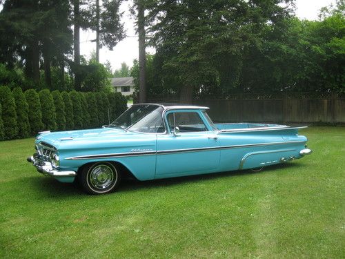 Stunning example of a true classic 1959 Chevrolet Elcamino sport truck,great classic for car shows,cruising or a killer shop truck for your Hot Rod shop !!!! New paint wet sanded and polished 1957 Belair Turquoise and Raven black exterior, all stainless removed when painted and all new clips. Stainless is straight and clean.Glass is all good throughout and windows roll as they should, uncut dash and stock gauges all working, heater and electric wipers,Tanue box cover black,New dual exhaust, New Edelbrock Endura shine intake and Edelbrock 4 Brl. carb, Chromed valve covers and air cleaner with K+N filter, New master and booster, Power front disc brakes, Power steering,Rams horn exhaust manifolds,Clean under the hood,Turbo 350 Automatic transmission with column shifter,CD sound system,New redone interior ,carpets and headliner as well.Never had any hydro's or Air ride done to frame solid front to rear with New Oldsmobile coils in the rear stock ones come with the car .HID headlights,Extremely Rare NOS 1959 Turnpike Cruiser skirts,Radials on stock rims and caps,1981 Front Camaro clip done right steers like a new car at all speeds.HEI ignition,rad as new,this car has no floor pan issues or replacement panels,doors click shut effortlessly,Rear deck is all new polished checker plate stock but have the stock steel deck and also a wood kit for the car in this sale.This Elcamino is for sale locally and will end auction and sell if Reserve has not been met.Selling well below investment.