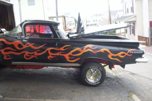 PLEASE READ ENTIRE DESCRIPTION TO UNDERSTAND THIS VEHICLE COMPLETELY, BEFORE BIDDING OR OFFERING. Without wheels/tires in picture, and hood scoop, $300 less. You'll get roller wheels and the hood piece. Now, here's the details. Over 10 years ago, I bought a stripped 59 Elcamino with no interior, but complete otherwise. Sold the old fashioned motor/trans (not sure if they were original), bought a 1982 Chevy pickup, slid the frame under the original X frame, welded them together, made braces where they didn't meet, and drove it and had it inspected every year after. Including the initial required inspection it had to get for the reconstructed title. DON'T BE SCARED OF THE RECONSTRUCTED TITLE. It is only reconstructed because of the alterations I made, not because of any accidents. The title itself no longer states 1959 Chevrolet, it is just stamped "reconstructed" multiple times. It is traced to the El by a new VIN plate issued by Penndot that was riveted to the upper firewall. But it is still currently insured as a custom 59 Elcamino by Grundy Worldwide for about $250 a year full coverage including towing. The body is all original, from what I can tell, and is starting to get a few rust bubbles here and there. Noticable only close up, so far. The "teeth" grille is in now, but I also have the original grille in great condition that goes with it. The motor is a 1973 Chevy Nova 350 4 barrel Edelbrock carb with HEI distributor. The transmission is a mid 70's Turbo 350 with non lockup converter. The rear is from a 1968 Nova and is a positraction unit. The entire functional frame is a 1982 Chevy 2WD pickup truck frame from a truck that was inspected and driven regularly by it's previous owner, until he didn't want it anymore. That's also where the motor and trans came from. The interior was amateur redone. Flame headliner, door panels, and floor mats. Currently has a bench seat in it from a late 80's pickup, where the seat frame was altered to sit lower and match the interior. Not ripped, torn, or busted, but doesn't match, so I threw a blanket on it for now. Really just needs a seat cover to match. Dash has original speedometer, fuel, and temp gauges that appear to work good. Aftermarket battery and oil pressure gauges mounted in the other two dash pods. Tachometer is mounted in the Bud can on the side of the hood scoop. Hood scoop is cutout and functional, but if you want it off, I still have the hood piece I cut out, and it can be welded back in and bodyworked to perfection. everything on this car/truck works. In the back, I cut out the wheel humps in the bed, and flattened them out because it sits high enough that they are no longer needed. The floor was custom made by someone before me. I removed the "hump" as it's no longer needed because of the height. The custom made bed cover is one piece fiberglass, and opens like a hood. I welded in hood hinges. Tailgate still opens and closes. That's about all I can tell you. Any questions left, ask. It is currently PA inspected until 09/14. Rims are Cragar S/S 15X10 rear and 15X8 front. Rear tires are new. Fronts are good used. Reverse lights are under rear bumper. ************BONUS*********** I have almost enough extra parts to practically build another 59 Elcamino. New fenders, new doors, new quarters, good used tailgate, used gauges, trim, glass, just about everything but a frame and hood. for an extra $2000 (firm) I will include them all if wanted. If not, just buy the vehicle and I'll sell the parts seperately. Parts will NOT be sold seperately unless the new owner doesn't want them. You can get me at FIVEsevenZERO sevenFOURzero ONEtwoFOURsix, or TONYKL68 at (opposite of cold)mail dot see oh em. All in small case letters. WANT MORE BIGGER AND BETTER PICTURES? Send a e-address and I'll send them.