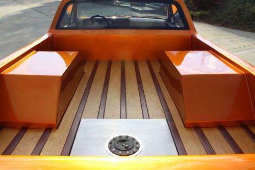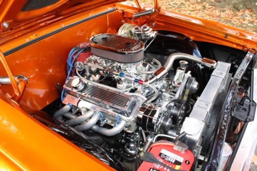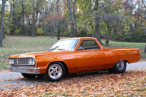 Up for auction: 1964 Chevy Pro Street El Camino. Exterior: PPG Orange Glow custom paint, Keyless Entry, Custom Tailgate, Shaved doors, Hideaway license plate, Fuel Cell. Suspension: S&W Race Cars ladder rack rear sub, Ford 9". Weld Pro Alum Wheels. Interior: Tan tweed bench seat, Tilt column/mahogany wheel, auto meter aluminum gauges in carbon fiber, B&M pistol grip shifter. Engine 445HP crate engine, Edelbrock alum heads, Custom powder coated serp. belt system. Edelbrock alum intake with two 4bbl carbs. Hooker ceramic headers with flowmaster exhaust. Aluminum rad with electric fan. Brake System: Power front disc, Rear drum, chrome master cyl. This car is a custom 2yr old frame up restoration. Best of everything, many other custom parts too numerous to mention.