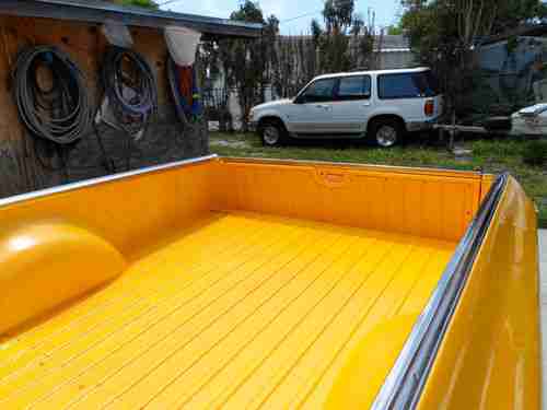 The Paint is a 2 Stage Base Coat-Clear Coat and the Color looks to be a YELLOW. The Paint job shines well and looks to be around 3yrs. old. I would consider the paint and the body to be in driver quality condition. The paint has some chips & scratches here and there. The body, the stainless trim and the chrome do show some signs of age here & there. It has a brand new set of rubber door seals. The door jams are nice & clean and painted black with no signs. The bed is nice & clean. It is rust free and has a nice looking sprayed in bed liner. The tail gate is clean and it opens and closes fine. All of the chrome and all of the stainless trim on this car is complete