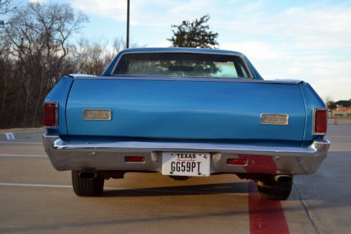 This is a 1969 Chevy El Camino with Automatic transmission. The cars exterior is Light Blue with White Racing Stripes. The interior is black vinyl with color matched blue interior pieces. The car has a CLEAN TITLE, is clean inside and out, with no rust, and runs and drives great. There are a few very minor imperfections and rock chips. Since I want you to be as informed as possible in your buying decision, I did my best to disclose all issues with the car in the pictures towards the bottom. This car is being sold as-is, without any existing warranty. Please don't hesitate to contact me to ask any questions at all.