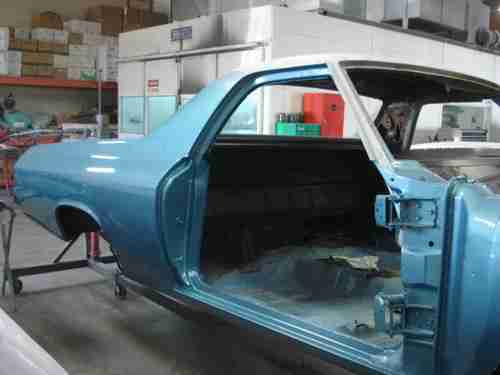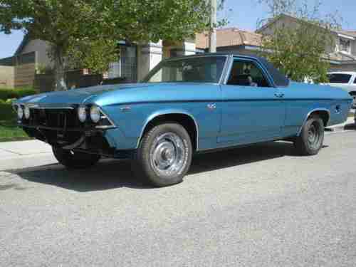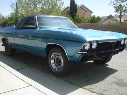 1969 El Camino SS 396 4 speed bucket seats, console, gauges, body off restoration. Frame and suspension completely powder-coated. This is an original California car and has no rust with the exception of the bed floor - please see pictures. This car runs excellent. The body is arrow-straight and is painted in code 55 Azure Blue with black interior, black stripe and black vinyl top. Car was originally Olympic Gold.