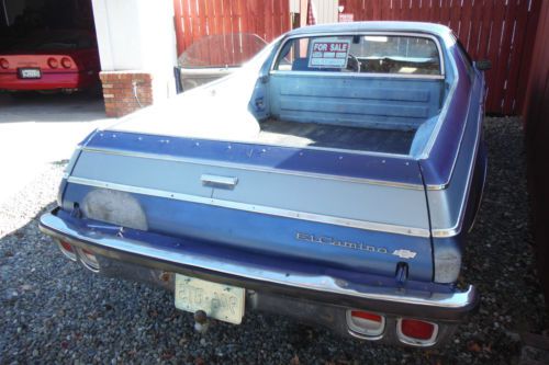 My ElCamino has many, many miles on it, and, over the years most all vital parts have either been replaced , repaired or rebuilt. Presently the only, MAJOR, problem with it is that it refuses to upshift into High gear. The basics are all in drivable , functioning condition. it has many small ailments as it has seen so many miles. I am the second owner of this vehicle. The first owner was a building contractor and used it in his business. The truck drives and handles VERY well , when the transmission allowed of course. The engine runs strong, but needs to be refreshed. The rear end has been replaced , and functions as desired. The steering feels very solid and smooth. The Body has some dents which have been worked on, and are presently primered as can be seen in the pictures.