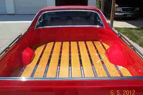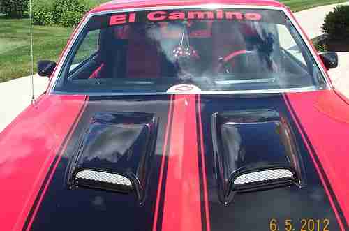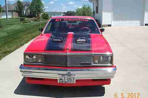 This 81 El Camino is a real show winner. I have a garage full of trophies it has won. I have owned this car for the last 6 years and during that time, it has been used only for car shows and parades. This car has not been a daily driver although it could be. It is always garage kept. It has not been smoked in. It has a 305 c.i. motor with headers and a 350 auto transmission. Everything under the hood has been chromed. The radiator cap and some of the bolts under the hood have chevy bowties. The bed is a beautiful wood with chrome strips. It has a ground effects kit all around. There are red neon lights under the body and red LED lights under the hood. It has air shocks on the rear. The interior has recently been redone in red and black and the chevy bowtie has been sewn into the headrest with the year (81) in the center. It has a AM/FM/CD radio and air conditioning. The wheels are 20" Pasati's and the tires have less than four thousand miles. This car is in great shape and runs and drives really good. I have tried to list everything but I will be glad to answer any questions you may have. This car is for sale locally so I reserve the right to end this auction at any time. Buyer is responsible for shipping.