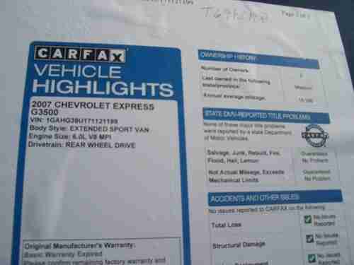 UP FOR ACTION IS A SUPER CLEAN 2007 CHEVY EXPRESS 3500 15 PASSENGER VAN. THIS VAN DOES NOT HAVE ONE DENT OR SCRATCH ON IT AND RUNS LIKE A DREAM. NO MATTER WHAT USE YOU HAVE FOR THIS VAN IT WILL SERVE YOUR PURPOSE. THE VAN HAS A CLEAN CARFAX AND A NICE SET OF TIRES. IF YOU HAVE ANY QUESTIONS FEEL FREE TO ASK. WE HAVE BEEN IN BUSINESS ALMOST 30 YEARS AND WOULD BE HAPPY TO HELP YOU IN ANY WAY WE CAN. AS ALWAYS THERE ARE NO FEES! WHAT YOU BID, IS WHAT YOU PAY. THANK YOU AND GOOD LUCK BIDDING!