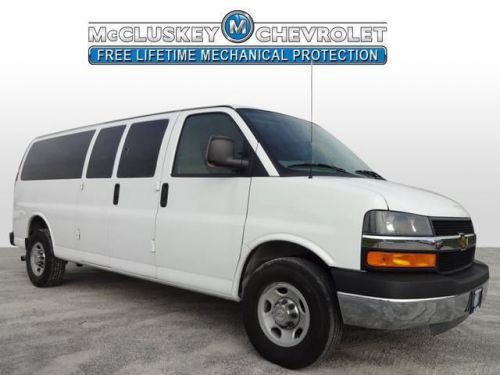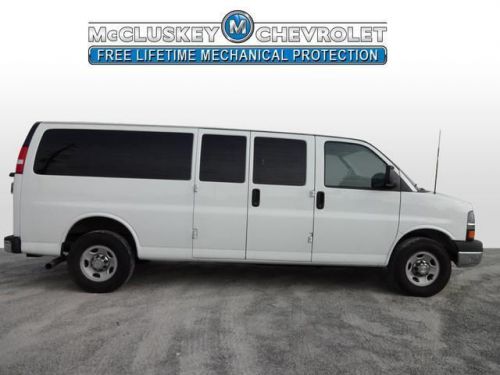 White Hot! Flex Fuel! McCluskey Chevrolet's Free Lifetime Mechanical Protection. If you demand the best, this wonderful 2012 Chevrolet Express Van G3500 is the van for you. Have one less thing on your mind with this trouble-free Express Van G3500. It is nicely equipped with features such as Auxiliary Lighting (Reading Lights and Underhood Lights), Convenience Package (Cruise Control and Tilt Steering Wheel), 12-Passenger Seating (2-3-3-4 Seating Config), 2 Speakers, 3.42 Rear Axle Ratio, 3rd row seats: bench, 4th-Row Bench Seat, 4-Wheel Disc Brakes, ABS brakes, Air Conditioning, AM/FM radio, AM/FM Stereo w/Seek & Scan, Delay-off headlights, Driver door bin, Driver vanity mirror, Dual front impact airbags, Electronic Stability Control, Emergency communication system, Front anti-roll bar, Front Bucket Seats, Front reading lights, Front wheel independent suspension, Fully automatic headlights, Low tire pressure warning, Overhead airbag, Passenger cancellable airbag, Passenger door bin, Passenger seat mounted armrest, Passenger vanity mirror, Power steering, Rear air conditioning, Rear Auxiliary Heater, Rear reading lights, Speed control, Tachometer, Tilt steering wheel, Traction control, Trip computer, Variably intermittent wipers, and Voltmeter.
