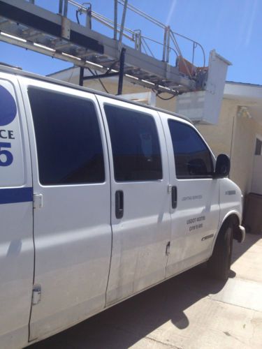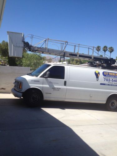 This Truck is "Sold as is" Still running good, has a tele lift on top that extends about 35ft up in the air, unfortunately lift doesn't work it needs to be repaired which costs about 800. 00. side door has a broken handle but still locks, and the a/c needs freon. The speedometer shows 195000 miles but the engine was rebuilt about 3 years ago,I used to work for the company Sylvania lighting where I bought this truck, when the engine was done. I don't have any paper work to show what it was done. truck has some minor scratches, other than that truck looks good and it has lots of room and racks. I'm selling it because I don't have a use for it any more I used to do exterior work such as parking lot lights and signs., but I'm not doing that any more.