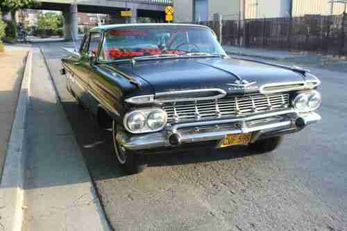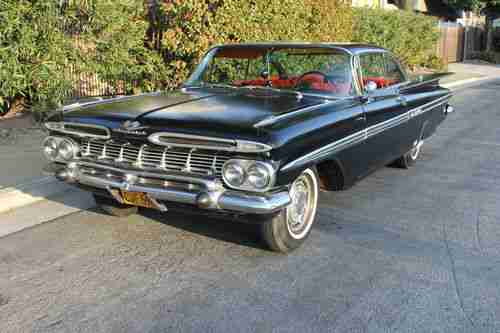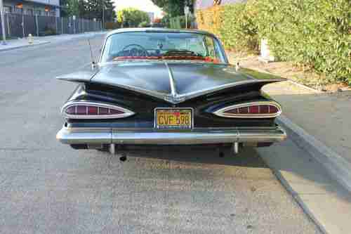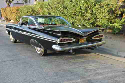 UP FOR AUCTION IS A 1959 CHEVROLET IMPALA 2DOOR SPORT COUPE. IT IS AN ORIGINAL 348 CAR. IT HAS A 283 IN IT RIGHT NOW. THE ORIGINAL 348 MOTOR WILL COME WITH THE CAR. THE 59 RUNS . FIRES RIGHT UP. INTERIOR IS A RED . OUTSIDE MOLDINGS ARE 100% COMPLETE . CLEAN VERY NICE SHAPE. THE IMPALA HAS A LITTLE RUST HER AND THERE NOTHING MAJOR . OUT SIDE PAINT IS BLACK. IT IS AN OLD PAINT JOB ON IT. IT IS A GOOD DRIVER. WOULD NEED PAINT AND INTERIOR WORK FOR SHOW. CAR IS A RUNNER. YOU COULD GET IN IT AND GO . THE 1959 IMPALA HAS A CALIFORNIA CLEAR TITLE . PLEASE EMAIL ME ANY QUESTIONS YOU HAVE . THANK YOU GOOD LUCK .