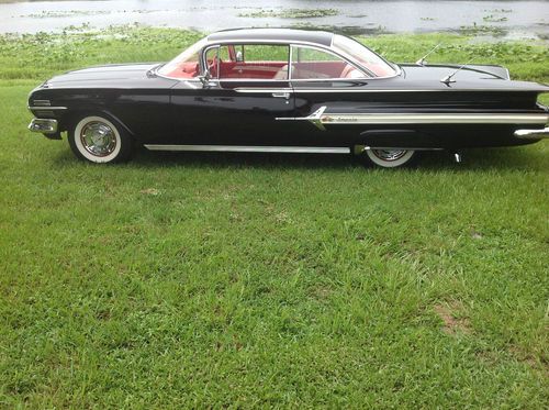 Listed is a 1960 Chevrolet Impala 2 door Hardtop. It was produced in this style for one year only. This car is said to be a 2 owner,1 family car with just north of 59,000 actual miles, documented as actual by the certificate of title. The car was originally female owned living most of its life in Augusta, Ga. The car has undergone a complete restoration about 3 years ago with the bulk of the work done early on. Please see the pictures that accompany this listing as they tell the story. The exterior is finished in Black with classic wide whitewall tires.. There is no rust anywhere on what appears to be all original panels and sheet metal and welds. The fit and finish is spectacular..Brilliant chrome and stainless, including $600 spent of the restoration of the hubcaps alone. Dual antennas and fender skirts are also included as part of the car. The interior has been restored as original in its brilliant and bright red and white colors. The dash is as well as all interior stainless are of equal quality as the rest of the car. Comfort features include power steering, air conditioning, Powerglide automatic transmission and working AM radio. The engine is a 283 Chevy power pack engine with a 4 barrel carb. that uses a factory style dual exhaust system. The engine compartment has been extensively detailed and is super clean and reflects the overall quality of this fine car. The undercarriage was most recently completed.to its highly detailed state. The car has not been seen any road miles since the undercarriage was completed. Refer to the many pictures of the undercarriage. A set of detailed restoration pictures accompany the car upon sale. This is an opportunity to purchase this fantastic southern car. Car sold as is. Please call Steve at 732-895-1227 prior to 10 PM ET. with any questions regarding this car. $1000 deposit required at the completion of the auction. Full payment balance due within 3 business days. We accept Paypal but prefer bank to bank wires or cash. If you elect to use Paypal for balance, please add 3% to cover the fees. Seller has the right to end auction if sold locally. Buyer is responsible for shipping. We will assist buyer with his reasonable transportation needs. .