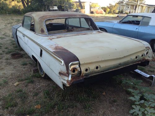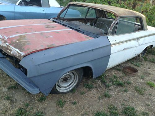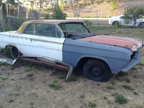 1962 Impala project-2 door. Frame has been cleaned and painted with por15. Need to bolt frame onto body. Engine compartment is painted. Needs carburetor .engine and transmission came off running vehicle. Front floor pans need to be welded in-have pieces. Under back seat needs rust repair. Missing trunk rods and rear hinges need to be installed. Trunk pan has small holes. Right lower section on quarter panel between tire and door needs rust repair. Needs wind shield and front seat. Have grill, bumpers, and most moldings. CAR IS BEING SOLD WITH BILL OF SALE. For more in please call: Jessie @ (831) 840-2587. Due to local listing I have the right to end the auction early. Buyer is responsible for shipping. Could store for up to 30days. I expect a $500 deposit with in 24 hours of auction ending and full payment with in 7 days.