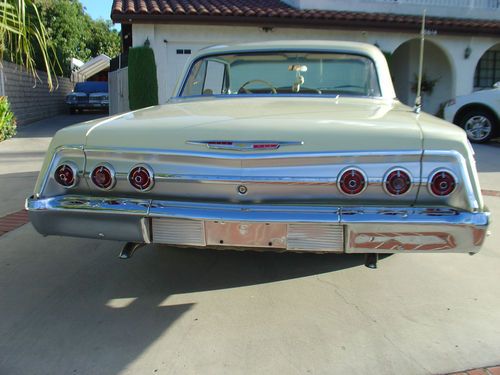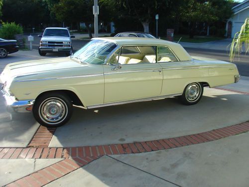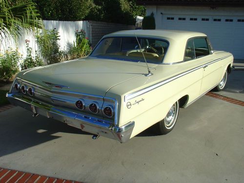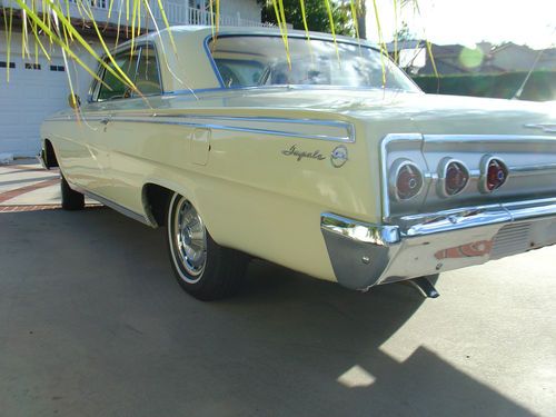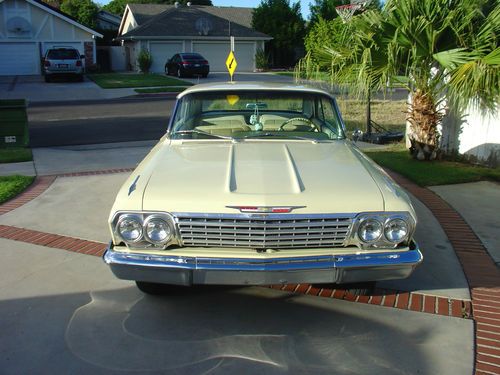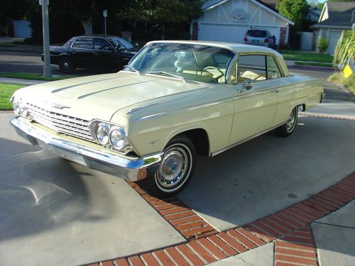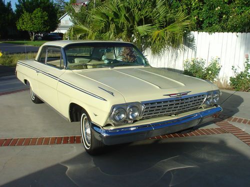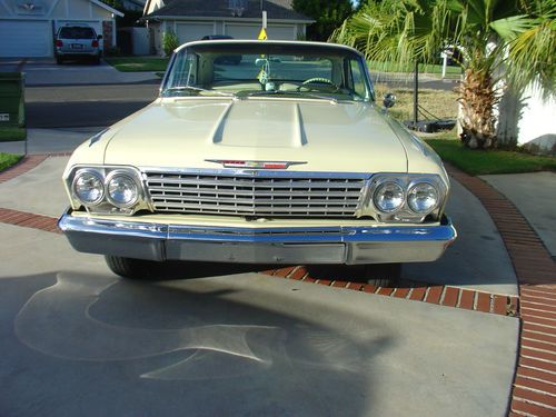 For sale I have a clean and all original 1962 CHevy Impala in the factory corona cream color. Paint is in very nice shape, body is very straight.Tires are in great shape and so are the original 62 impala hubcaps with matching skirts for the rear. Interior is in excellent condition and all original no tears or rips or anything. Engine is a 283 that was rebuilt about 5k miles ago that runs excellent and fires right up and runs real nice with dual exhaust with a powerglide transmission. The entire front suspension has been rebuilt also with all new bushings etc so car drives straight down the road. All the lights and guages and signals work on this car. It has power steering. Car is being sold As-Is with no warranty and is the buyers responsibilty to check car prior to bidding. Car is Located in Los Angeles and has a clean title in hand. I have sold a couple cars to overseas buyers and out of state buyers in the past and can offer to deliver the car to any of the shipping companys here in southern california or can give you the numbers to a few shipping companys ive used many times with no issues. Most of my cars end up selling before the auctions even end so i have the right to end the auction early if the car sells locally. IF YOU HAVE ANY QUESTIONS YOU CAN CALL ME ON MY CELL AT 714-401-3854 thanks