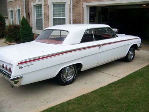 1962 impala 2 door coupe this is not a show car but a very nice solid car to be driven as is or to restore. Previous owner started to do an ss clone job but did not finish. Car has bucket seats that has been recovered as well as the back seat's in door panel's. The car has some surface rust on the body in the usual place's . Car also has two small rust spot's on driver side lower roof area. There is some pin holes on the drain rail area in the trunk. Car has a small block 350 engine with a 350 automatic transmission. Brand new dual exhaust from front/back with flow master's. Car has no power steering but does have power brakes. Car has small dent on trunk but nothing serious. This is a bill of sale car in I have already had a T22B form done by an Georgia Henry county Sheriff Deputy. The officer ran a world wide check on Vin Numbers in it came back clean on 7/11/2013. So there are no issues with the car being registered . If you have any ? call me at 770-291-9296 Byron