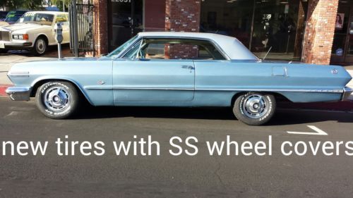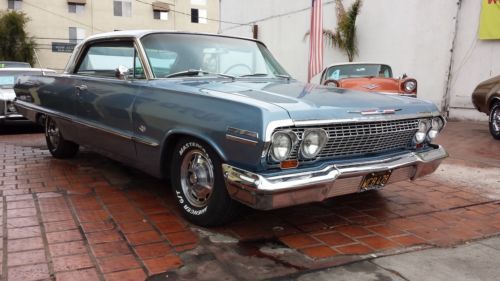 1963 Chevrolet Impala Super Sport being offered for sale for the first time in 22 years. This California black plated car has a grey leather interior and power windows have been installed. It has not been cut or chopped and sits on 14" wheels with the Super Sport wheel covers with new tires. Dual exhaust gives this car a nice throaty sound. Automatic transmission, CD player, custom two toned paint, bucket seats, center console.