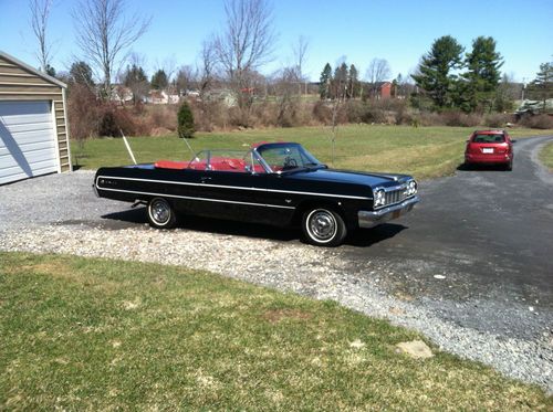 Original 1964 Chevy Impala Convertible. One repaint of original tuxedo black, very shiny. Dual exhaust & dual antennas. Original top in very good shape, goes up & down with ease. Back window is opaque & unzips easily. No rust on body, laser straight, southern car that has been stored in a heated garage for the last 14 years. Under carriage is excellent. Super sport badges on back quarter panels & SS spiner wheel covers. Mechanicaly car can been driven daily. Original (overhauled) 283 engine & 2 speed power glide transmission. 14 inch radial tires. Matching numbers, Car has been recently tuned. Car is an excellent drivers quailty & woudn't take much to make it show quality. All glass is good, all gauges work. this car is ready for summer cruzing.