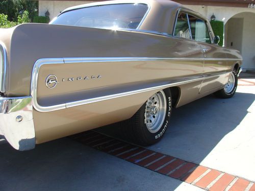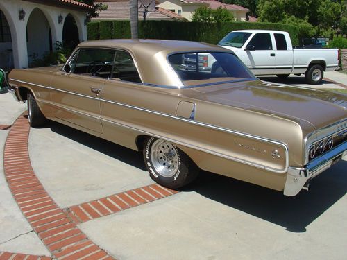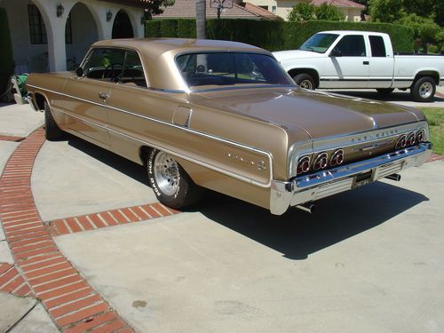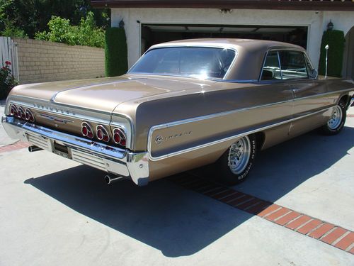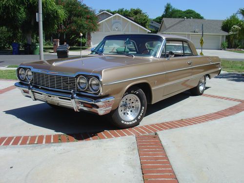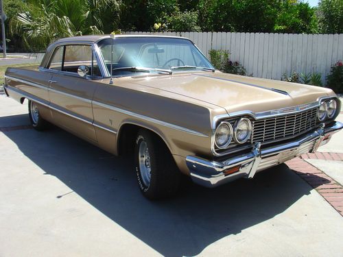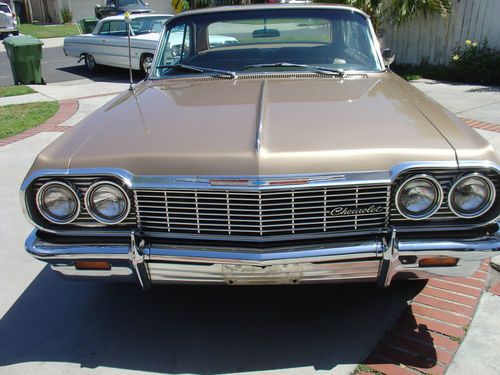For sale i got an clean original saddle colored 1964 Chevy Impala coupe. This car is in excellent condition, paint is close to perfect not even a single scratch anywhere and body is laser straight, original 327 engine that has been rebuilt with some extra chrome goodies, engien fires right up and runs excellent powerglide transmission shifts great, power steering. has somekind of Rally rims on it that are not original to the car. Interior is in excellent condition original except the carpet which is brand new, dash pad is the original dash pad and is in excellent shape with no cracks. Everything on this car works all the interior lights, turn signals, dash guages, headlights, everything, new brakes..You just dont find them like this anymore undercarriage is super clean and 100% rust free no rust ANYWHERE on this car. Car is being sold As-Is with no warranty and is the buyers responsibilty to check car prior to bidding. Car is Located in Los Angeles and has a clean title. I have sold a couple cars to overseas buyers and out of state buyers in the past and can offer to deliver the car to any of the shipping companys here in southern california. Most of my cars end up selling before the auctions even end so i have the right to end the auction early if the car sells locally. IF YOU HAVE ANY QUESTIONS YOU CAN CALL ME ON MY CELL AT 714-401-3854 thanks