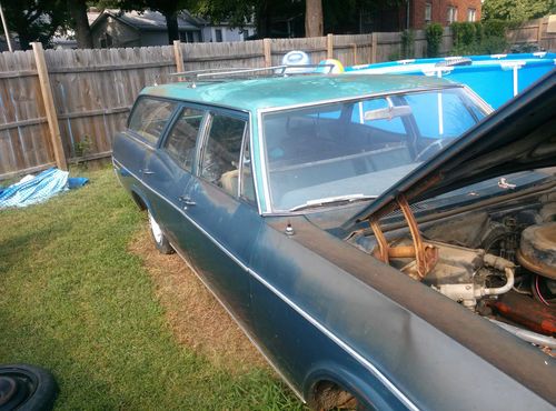 here we have a 65 impala wagon with belair trim. original owner ordered it with a/c, all the chrome he could get, i have never seen a 65 with this much chrome. Manual steering, manual brakes. i have a power rear window and harness to put into the car. He drove it to work everyday 5 miles round trip. In 84 he rear ended a truck, drove it home and parked it in the basement. There it sat until his passing last year. It runs and moves but the brakes are shot.. The motor smokes of course but runs like a sewing machine. The carb leaks and needs to be rebuilt. Basically every system needs to be gone thru. The passanger side inner and outer tie rod is bent, the tow truck that picked up the car hooked it around them and bent them.The car is very solid with some minor rust thru in 1 spot on both back windows. The carpet is more than likely gonna need to be replaced, the seats and headliner are actually pretty decent. The title was dated but is unsigned by a purchaser, signed by seller. This is not a 9 seater. Im trying to be as honest as possible, if you have any questions feel free to call me at 314-809-7048. Please leave a message if no answer as i work nights and am sometimes out of cell service. Thanks