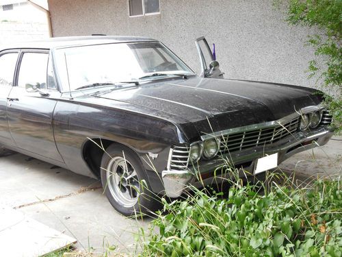 This is a 1967 Chevy Biscayne, the sister model to the Impala. Engine is a 283 V8 and has been rebuilt. It has 4447 original miles - the rebuilt engine has less than that. Clear title. Has driven successfully from Utah to Washington state. Ran great until serpentine belt slipped and blew a gasket. Currently has a couple oil leaks (probably due to gasket deterioration), but does start and can drive. However, I wouldn't recommend driving it until the gaskets have been replaced.